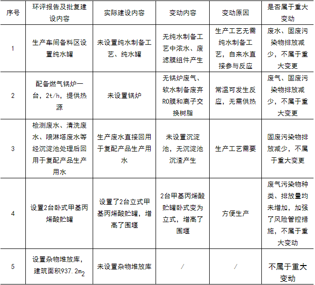 對比項目實際建設內(nèi)容和環(huán)評報告及批復文件,項目變動情況如下表所示: